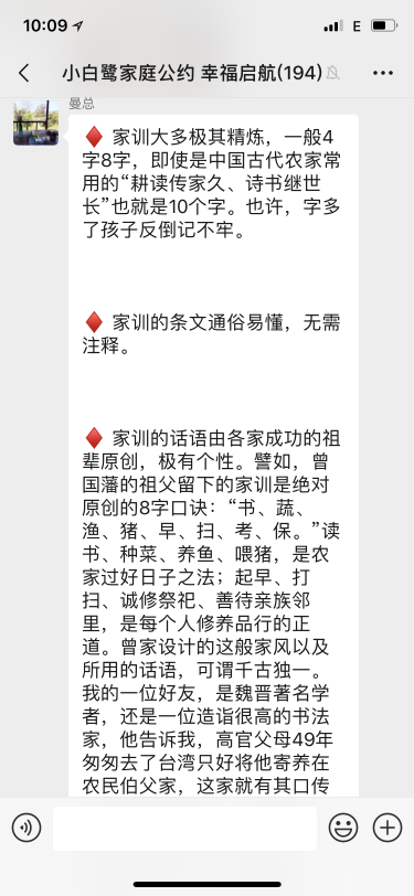 2019年12月12日,白鷺街小學(xué)家庭公約—幸福啟航微信線上學(xué)習(xí)群里,曼子老師從孔子的“庭訓(xùn)”講起,推及中國的家訓(xùn)特質(zhì)。她講到,古時家訓(xùn)一般不立文字,像孔子、湯家這樣的學(xué)富五車之家,都是不立文字的,用的是口傳心授之法,對幼童進行口授心授有著無可比擬的傳授效能。因為人類的直立導(dǎo)致母親產(chǎn)道狹窄,而人的腦袋又越來越大,只好提前分娩,讓嬰兒在母親體外完成發(fā)育,這也就意味著幼童大腦發(fā)育過程較長,在其發(fā)育過程中的口傳心授家訓(xùn),其銘刻效果最佳。特別是母親的口傳心授,在諄諄言教之時便有切切身教之師范,說服力極強,所以母親被定義為“民族品格第一塑造人”。