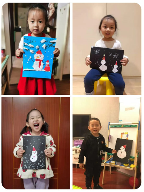 (3)將材料粘在黑色卡紙上,黑色記號筆畫出雪人眼睛和紐扣。