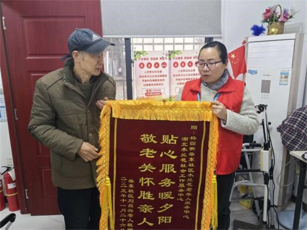 “這面錦旗,是我們全家的心意!”黃興忠老人送來的錦旗上,“情系獨居送溫暖,熱情耐心勝親人”十四個字格外醒目。他今年84歲,子女遠住的比較遠,家里的水管漏水、電燈損壞,都是社區老年人服務中心的工作人員上門幫忙修理;天氣變化時,還會特意打電話提醒他添衣保暖。“上次我感冒發燒,工作人員不僅幫我買了藥,還熬了粥送過來,說‘您趁熱喝,發發汗就好了’,這話聽得我心里比粥還暖。”